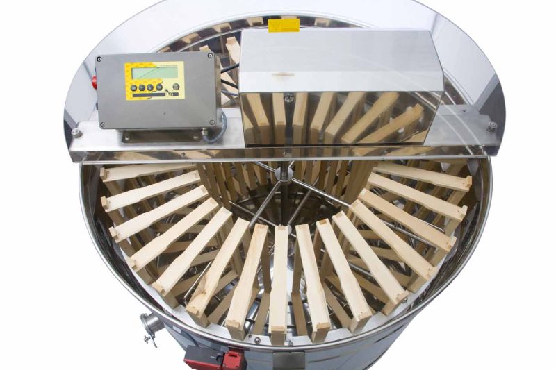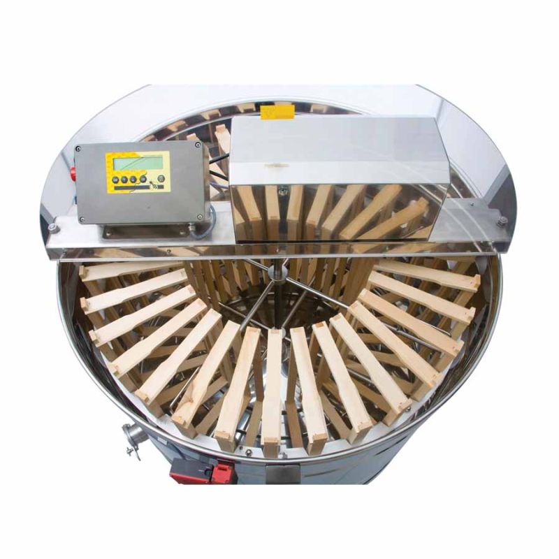 32-Waben Radialhonigschleuder, mit Motorantrieb 370 W / 230 V, vollautomatischer Steuerung und integrierter Sicherheitseinrichtung, welche den Motor bei Deckelöffnung automatisch abschaltet. Modernste Technik ermöglicht eine innovative Ausarbeitung des Honigschleuderbodens. Der Boden des Kessels ist nahtlos geschweißt und Richtung Auslauf geneigt. Schleuder hat zwei rostfreie Quetschhähne (6/4'' und 2''). Der Quetschhahn 2'' ist am tiefst möglichen Punkt eingebaut, damit der gesamte Honig aus der Honigschleuder abfließen kann. Alle Teile der Honigschleuder, die mit dem Honig in Berührung kommen, bestehen aus lebensmittelzugelassenen Materialien. Der Deckel ist aus durchsichtigem Acrylglas.